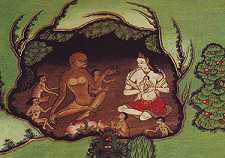 很早很早以前,观世音菩萨派一有神变示现的猕猴到西藏雪国的地方修行。这个猕猴来到了一个黑色山岩上,潜心修习菩提慈悲心,对于佛法有了很深的领悟。就在这时,有一个住在邻近地方的岩魔女来到他面前,用非常爱慕的口气说:“让我们结成夫妻吧!”猕猴与魔女结为眷属以后,生下了六只小猴,他们生性爱好各不相同,在树林里各自寻找生活。过了三年,父猴再去探望时,小猴已繁衍到500多个,此时树上的果实已经吃完,又别无可吃的食物。父猴于是返回神界,取来青稞、小麦、豆子、荞麦、大麦芽,撒到大地上,使那里长满不种自生的谷物,猴子们因得到充足的食物,身上的毛和尾巴都变短了,又慢慢懂得使用语言,这样变成了人,成为雪域高原的先民。