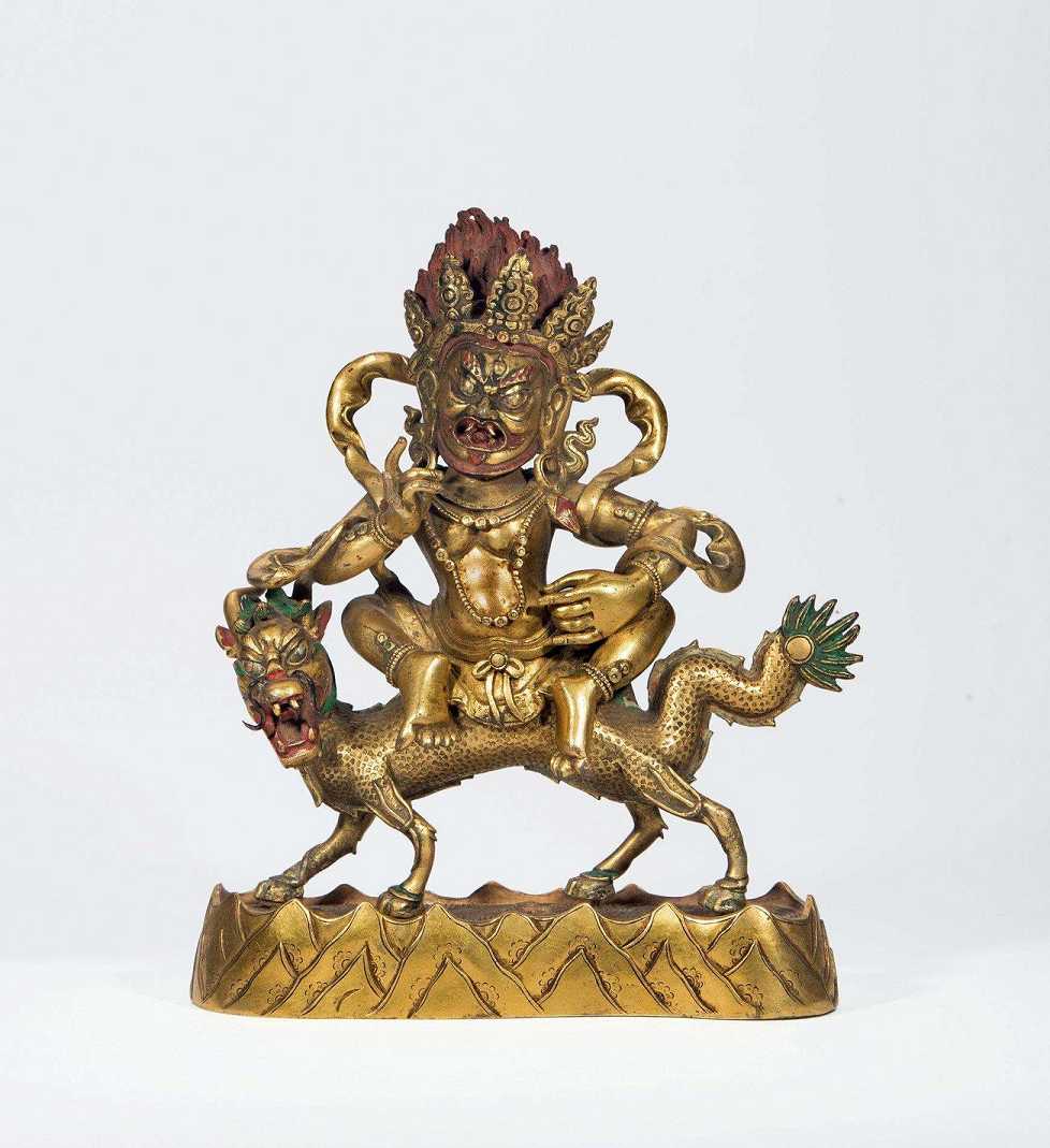 他头戴五佛冠,头顶有象征愤怒的火焰。三只眼,张着大嘴。左手持三股戟,右手拿一根短棒,有时是两手置胸前拿绳索。他坐在一条龙身上,为舒坐势。龙张牙舞爪,头尾高高翘起。龙有四脚,前面右脚踩一个圆形物。这位财神在藏传佛教寺庙里也较常见。