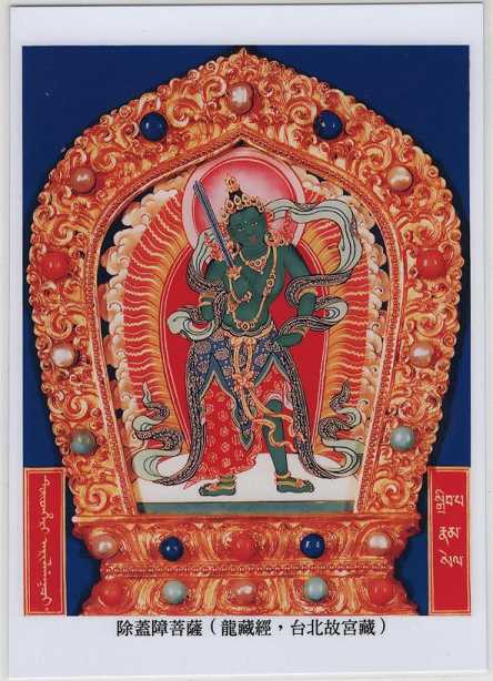 “除盖障菩萨”乃是消除一切五毒“盖障”烦恼之意,菩萨以净菩提心照明诸法,就像用阳光去除黑暗,让世界沐浴于清净光亮之中,使众生不留一丝烦恼。“除盖障菩萨”能去除一切障碍的菩萨,又称降伏一切障碍菩萨,是“胎藏界”曼荼罗除盖障院的主尊。“除盖障菩萨”能够消除一切烦恼,特别是以贪、嗔、痴、慢、疑为代表的“五毒”,即五种“盖障”烦恼,并能随心所欲的生出财宝。