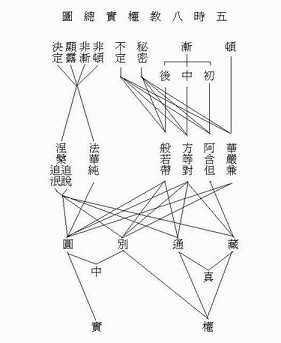 佛祖之要。教观而已矣。观非教不正。教非观不传。有教无观则罔。有观无教则殆。然统论时教。大纲有八。依教设观。数亦略同。八教者。一顿。二渐。三秘密。四不定。名为化仪四教。如世药方。五三藏。六通。七别。八圆。名为化法四教。如世药味。当知顿等所用。总不出藏等四味。藏以析空为观。通以体空为观。别以次第为观。圆以一心为观。四观各用十法成乘。能运行人至涅槃地。藏通二种教观。运至真谛涅槃。别圆二种教 观运至中谛大般涅槃。藏通别三。皆名为权。唯圆教观。乃名真实。就圆观中。复有三类。一顿。二渐。三不定也。为实施权。则权含于实。开权显实。则实融于权。良由众生根性不一。致使如来巧说不同。且约一代。略判五时。一华严时。正说圆教。兼说别教。约化仪名顿。二阿含时。但说三藏教。约化仪名渐初。三方等时。对三藏教半字生灭门。说通别圆教满字不生不灭门。约化仪名渐中。四般若时。带通别二权理。正说圆教实理。约化仪名渐后。五法华涅槃时。法华开三藏通别之权。唯显圆教之实。深明如来设教之始终。具发如来本迹之广远。约化仪名会渐归顿。亦名非顿非渐。涅槃重为未入实者。广谈常住。又为末世根钝。重扶三权。是以追说四教。追泯四教。约化仪亦名非顿非渐。而秘密不定二种化仪。徧于前之四时。唯法华是显露。故非秘密。是决定。故非不定。然此五时。有别有通。故须以别定通。摄通入别。方使教观咸悉不滥。今先示五时八教图。次申通别五时论。