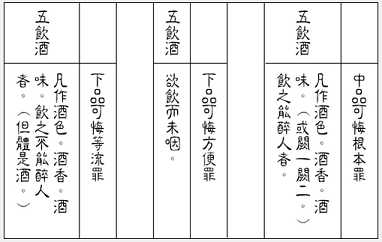 罪分上中下三品。杀盗淫妄四戒。皆具三品。饮酒一戒。唯有中下二品。故先后别列。