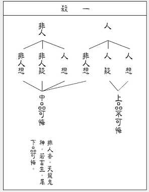 若人。作人想。杀。是罪不可悔。人。作非人想。杀。人中生疑。杀。皆犯不可悔。非人。人想杀。非人中生疑。杀。是中罪可悔。