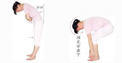 盘腿—垂头、弯腰—放松颈部腰部(向左右侧亦然)。使坐时,身能‘正而松’,(注意:趁吸气,坐直起来)